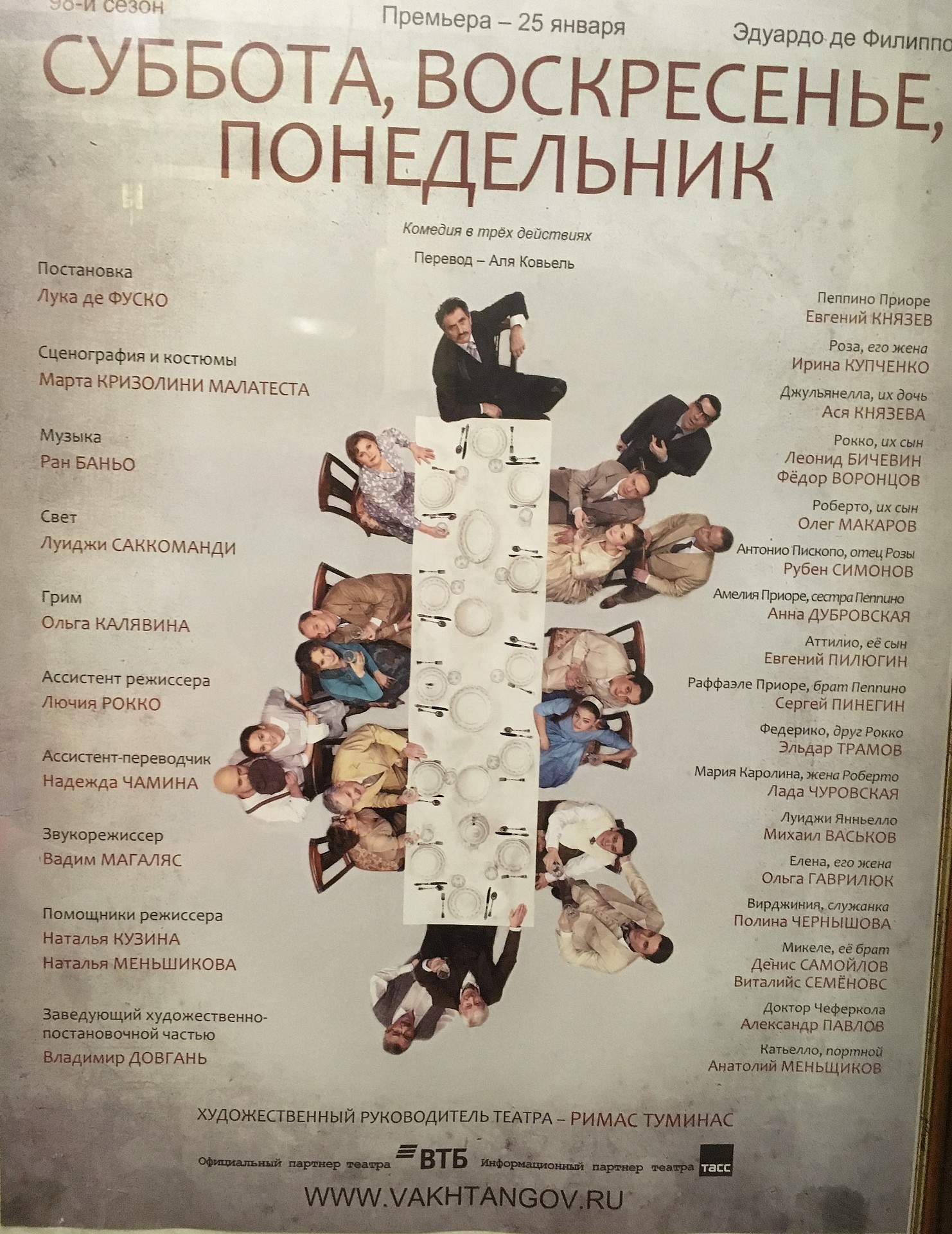 Снова про театр1 622 Воскресенье, 10 марта 2019, 17:58 Хотел поделиться впечатлениями от очередого посещения театра им. Вахтангова, одного из моих самых любимых, но было бы нечестно по отношению к театру не помянуть в начале добрым словом ушедшего Владимира Абрамовича Этуша. Светлая память этому преданному служителю вахтанговской сцены, педагогу, фронтовику. Февраль выдался пустым с точки зрения освоения культурных мероприятий (не устану повторять, что Москва предоставляет огромный выбор всего и на любой вкус и кошелек). В марте вернулись к семейной уже традиции посещения московских театров. Как-то сам незаметно для себя превратился в театрала, ну, или если поскромнее, любителя театра в последние лет пять-шесть. Ходим с удовольствием, обсуждаем, спорим, и даже как-то ушли в антракте — не понравилось категорически! И вот театр им. Вахтангова, в моем понятийном ряду, один из самых таких театристых. Театр театрович, что ли. Зал, фойе, антураж, портреты актеров на стенах, история театра в фотографиях и вещах, буфеты (святое!), и вот уже и публика кажется этакая потеатральнее, чем в других… И вот так сложилось, что посещение именно вахтанговской сцены отдает особой праздничностью, особым душевным настроением. Мы многое что смотрели там. И Дядя Ваня, и Онегин, и Царская охота (закрывающий спектакль с блистательными Ароновой, Вдовиченковым и Князевым), и Ветер шумит в тополях, и многое уже другое. Так иногда начинаем вспоминать — «а где мы видели Гуськова с Вележевой, что-то не припомню… ааааа, ну как же, в Обычных людях» (и то призадумаешься, не соврал ли в названии). Кстати, театр, именно театр раскрывает актера. Я совершенно не воспринимал серьёзно Владимира Вдовиченкова, пока не увидал его в роли доктора Астрова в Дяде Ване. А оказалось, что он сильный драматический актер, и уже другие спектакли с его участием шёл посмотреть целенаправленно. Кстати, также примерно для меня раскрылась на сцене и Алёна Бабенко в современниковском Пигмалионе, неожиданно, интересно, сильно. В этот раз, 8 марта, по унылой московской погоде, прогулявшись по Новому Арбату, который и в 2019 году не выветрил из себя советского духа (несмотря на все эти вывески и огни), посидев в Вареничной, мы двинули на преьерный спектакль этой зимы Суббота, Воскресенье, Понедельник. Так, кстати, вышло, что билеты брали допольно поздно, и довольствовались бельэтажем, но, как оказалось, и там можно наслаждаться хорошим спектаклем. Потому что спектакль и вправду хорош! — этакая слегка суматошная итальянская комедия в трех действиях (при нетипичных двух антрактах), где солировали Ирина Купченко и Евгений Князев в роли мужа и жены. Знаете, в этих итальянских комедиях, однако, так исподволь порой проскакивают такие драматические ниточки, так ухватывает за сердце в тонких жизненных вещах, что начинаешь задумываться, пришел ли ты в театр смеяться, или и смеяться, и размышлять… Сюжет пересказывать не буду. Не умею, да и лучшая рецензия — это пойти и посмотреть самому. На мой взгляд, спектакль получился. Он сложился, хотя, конечно, будет набирать своё сценическое «мясо», крепнуть. Так что можно порадоваться за режиссера, итальянца Луку де Фуско, и за замечательный ансамбль актёров (отдельно — Рубену Симонову спасибо за роль дедушки). Ну и Анна Дубровская хороша — супруга подметила, что я частенько брал б