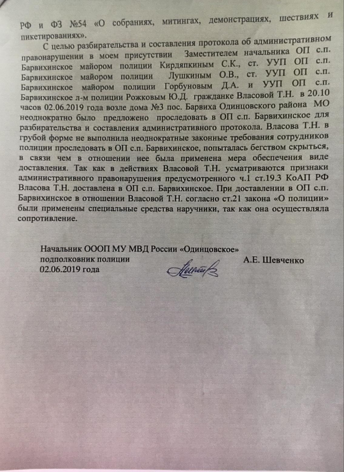 Подполковник Шевченко: «в отношении Власовой Т. В. были применены специальные средства наручники, так как она осуществляла сопротивление»