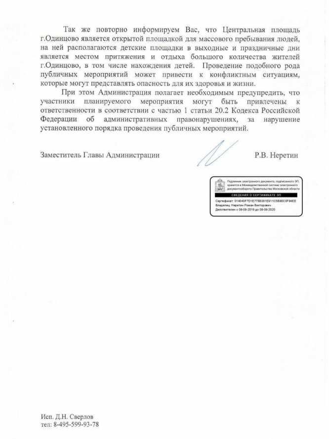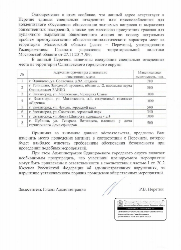 Цитата: «согласование проведения публичного мероприятия в запрашиваемом месте и времени не представляется возможным в связи со следующим.Естественно, не для такого красавца меня мама растила и профессора учили! Я подал повторное обращение, в котором отказался идти туда, куда «Неретин всех послал» и потребовал соблюдать установленный законом порядок согласования публичных мероприятий. Но позиция умудренного опытом заместителя Андрея Иванова была непреклонна…