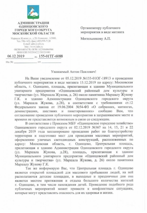 Еще одна статья уголовного кодекса в копилке администрации Андрея Иванова3 104 Понедельник, 16 декабря 2019, 03:52 15 декабря 2019 года в Одинцове возле памятника маршалу Жукову Г. К. мог пройти митинг, просвещенный годовщине контрнаступления Красной армии под Москвой в декабре 1941 года на тему «Битва под Москвой. 1941-2019. Сохранили ли мы социальные завоевания предков?». Помимо участников митинга — жителей Одинцовского городского округа и Звенигорода — на митинге должны были выступить и приглашенные гости: депутаты Совета депутатов ОГО, представители различных патриотических движений, была достигнута предварительная договоренность об участии в митинге депутата Госдумы, а также ветеранов боевых действий и даже Героя России. Планировалось собрать до 500 человек. И все это могло бы произойти в Одинцове, но не произошло… Почему? Потому что Глава городского округа Андрей Иванов и его заместители решили, что конституционные права граждан в Одинцовском городском округе ничего не значат. Впрочем, как и сами жители, наверное, с которыми Андрей Иванов предпочитает не общаться лично (запись на прием возможна только на несколько месяцев вперед, и то, после долгих дискуссий с секретарем и без гарантий!). Являясь одним из организаторов намеченного публичного мероприятия, я в установленные законом сроки подал соответствующее уведомление на имя Главы округа о предстоящем возле памятника маршалу Жукову митинге. Напомню, что в соответствии со ст.31 Конституции РФ Цитата: «граждане Российской Федерации имеют право собираться мирно, без оружия, проводить собрания, митинги и демонстрации, шествия и пикетирование»В соответствии с Федеральным законом от 19.06.2004 №54-ФЗ «О собраниях, митингах, демонстрациях, шествиях и пикетированиях» (далее ФЗ-54) Цитата: Публичное мероприятие может проводиться в любых пригодных для целей данного мероприятия местах в случае, если его проведение не создает угрозы обрушения зданий и сооружений или иной угрозы безопасности участников данного публичного мероприятия. Условия запрета или ограничения проведения публичного мероприятия в отдельных местах могут быть конкретизированы федеральными законами (ч.1 ст.8 ФЗ-54).Закон четко регламентирует действия организаторов и органов местного самоуправления при подготовке и согласовании публичных мероприятий. Там, конечно, имеется возможность предложения иного места проведения, но настаивать администрация на этом может только по веским основаниям, установленным, опять же, законом. Законом же установлен порядок определения и использования специальных мест для проведения публичных мероприятий. Их использование, при наличии, хоть и носит «приоритетный» характер, но не исключает проведение мероприятий и в иных местах. Правда, при условии согласования с органом местного самоуправления. Цитата: После определения органом исполнительной власти субъекта Российской Федерации в соответствии с частью 1.1 настоящей статьи специально отведенных мест публичные мероприятия проводятся, как правило, в указанных местах. Проведение публичного мероприятия вне специально отведенных мест допускается только после согласования с органом исполнительной власти субъекта Российской Федерации или органом местного самоуправления. Орган исполнительной власти субъекта Российской Федерации или орг