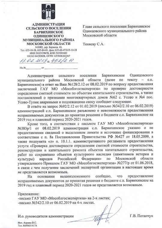 Благодаря лишь одной выполненной экспертизе, удалось уменьшить сметную стоимость только по одному объекту на 18%, уже сэкономив 6 млн рублей для бюджета. Если предположить, что во всех сметах такая же «погрешность» в расчетах, то с 300 запрашиваемых администрацией миллионов можно сэкономить более 50! Много это или мало? По «Макаровским», московским, меркам, наверное, это несущественная сумма. А для простых местных жителей Бавихи цифра невообразимая! 15 февраля Сергей Теняев направил Потапчуку письмо, в котором разоблачил «злодеяния» и. о. руководителя администрации, объявил ему о полном служебном несоответствии, пригрозил увольнением и потребовал до 18 февраля предоставить копии договоров с ГАУ МО «Мособлгосэкспертиза», направить в ГАУ МО «Мособлгосэкспертиза» необходимые сведения, подтверждающие предполагаемую (предельную) стоимость объектов капитального строительства и источники финансирования, принять меры для оплаты договоров по проверке достоверности определения сметной стоимости объектов капитального строительства и получить заключение экспертизы, а также принять необходимые решения о признании д. №4 в п. Усово-Тупик и д. №62 в с. Усово аварийными и подлежащими сносу. Письмо Главы СП Барвихинское Сергея Теняева и. о. руководителя администрации поселения Герману Потапчуку от 15 февраля 2018 года