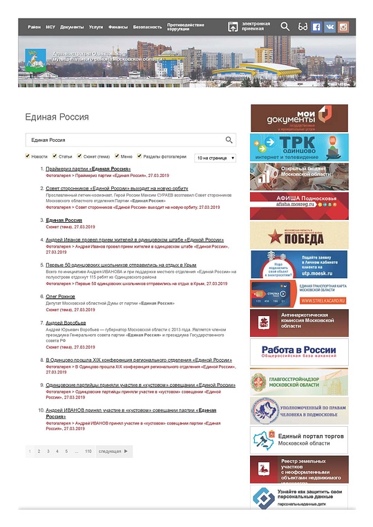 «Единая Россия» проводит предвыборную компанию в Одинцово с применением административного ресурса3 946 Четверг, 28 марта 2019, 13:32 Одной из главных задач власти при проведении выборов должно быть обеспечение «равного избирательного права». Однако, это право, на мой взгляд, нарушается. В избирательной компании партия «Единая Россия» широко и на мой взгляд, незаконно использует административный ресурс. Пример 1. Сайт Администрации «ОГО» Деятельность Администрации Одинцовского района финансируется всеми налогоплательщиками независимо от партийной принадлежности. Однако официальный сайт администрации Одинцовского района публикует статьи о деятельности одной политической партии: «Единой России», и не только о деятельности «Единой России», её партийных проектах, но и о кандидатах, выдвинутых этой партией… Даже специальный хештег #ЕдинаяРоссия есть. Деятельность других партий и кандидатов не упоминается. 12 марта 2019 года был зарегистрирован список кандидатов в депутаты Совета депутатов Одинцовского городского округа по единому избирательному округу, выдвинутого избирательным объединением Московское областное региональное отделение Всероссийской политической партии ЕДИНАЯ РОССИЯ на выборах, назначенных на 21 апреля 2019 года. Среди кандидатов в этом списке — Глава Одинцовского муниципального района и секретарь местного отделения «Единой России» Андрей Иванов, Лариса Лазутина, Владимир Горяев, партийная деятельность которых освещается на сайте администрации и создает положительное отношения избирателей к кандидатам. Таким образом, публикации на сайте администрации Одинцовского района носят агитационный характер, агитация ведётся в пользу кандидатов от одной партии: «Единой России». Муниципальное имущество используется для агитации в пользу только одной партии-что это, если не нарушение? 2. Печатные СМИ То что, местные муниципальные газеты давно превращены в «боевые листки» Единой России-это уже давно свершившийся факт. Однако и мириться с бессовестной агитацией в пользу одной партии в период предвыборной избирательной компании тоже нельзя. Последний выпуск газеты «Одинцовская неделя» Администрации Одинцовского муниципального района: На обложке и трёх полосах — фотографии главы района и лидера партийного списка на выборах Андрея Иванова. В статье «Дела партийные» и ещё трёх материалах пишут о «Единой России» и кандидатах этой партии. Других партий в газете нет. Налицо нарушение «равного избирательного права», а также использование муниципального имущества в интересах одной партии. Пример 3. Организация «кривых» линий с участием Иванова А. Р. Главная задача муниципальной власти в период выборов (должна быть)-организация равных выборов в целях наиболее объективного отражения волеизъявления народа. В развитых странах муниципальные руководители обычно уходят в отпуск, чтобы не влиять на процесс выбора. Что же у нас в Одинцовской избирательной компании? Агитация на ТРК Одинцово -каждый кандидат получает по 3 минуты прямого эфира на Одинцовском ТВ, причем его выступление никем (Одинцовским ТВ) не записывается и потом нигде не выкладывается (хотя, могли бы например выложить на Ютуб канале Одинцовского ТВ). Иванов А. Р. является таким же кандидатом как и все, почему он поставлен в превосходное положение по сравнен